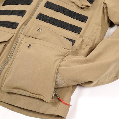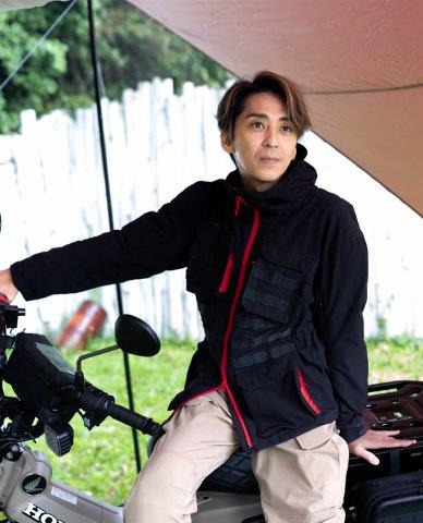 バイク用ウェアとキャンプ用ウェアの融合。「焚火を楽しむ難燃性」と「快適に動けるストレッチ性」を両立した新たなファブリックを採用。身頃には追加装備や拡張性に優れるウェビングを多数配置。ミリタリー調のデザイン性にも一役買っている。別売りインナー取り付け用ファスナーを両腕内部に備え、冬のキャンプツーリングにも対応。(インナー品番:FIRJ-W216) 活躍の広さはまさに「着る道具」でありバイクとキャンプをシームレスに繋げる新たなプロダクト。