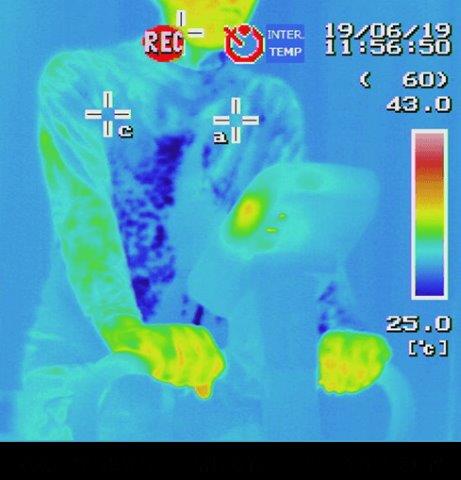 このプリント処理した生地が、人の皮膚から発生する水分(汗)を吸収すると、その吸熱特性により生地温度が下がり、冷感を付与。