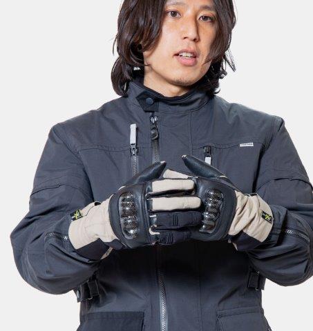 ハードナックルプロテクターが放つ無骨な存在感と、テキスタイル素材ならではのやわらかな質感と落ち着いた色味。そのギャップが魅力の、スタイリッシュな秋冬用グローブ。ナックル部には本格仕様のカーボンプロテクター×レザーを採用しながらも、全体は落ち着いたトーンでコーディネートしやすいデザインに仕上げました。甲側には防風・防水・透湿・撥水性を備えた素材を使用し、内側には厚めの中綿を内蔵。冬の冷気をしっかりブロックし、あたたかさをキープします。掌側にはしなやかで握りやすい素材を採用し、各所に滑り止めを配置することで操作性もアップ。グローブ全体には防水透湿フィルムをインサートし、雨風の侵入を防ぎながらもムレにくい構造に。掌の付け根には衝撃吸収素材PORON®XRD®を内蔵し、安全性や疲労感の軽減にも配慮しました。スマートフォンやグリップヒーターにも対応。安全性と快適性、そしてスタイルを妥協しないライダーのための一双です。