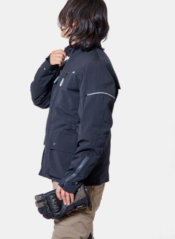 アドベンチャーライドに対応する本格仕様のライディングジャケット。防風・防水・透湿・超撥水の実用素材に、シームテープ加工を施した防水仕様で、天候の変化にも柔軟に対応します。フロントは防風、防水性能を高める2重フラップを採用。内側には、軽くてやわらかな着心地のボアインナーを装備。脱着式で単体着用もでき、寒さやシーンに合わせて柔軟に使い分けが可能です。脇と背中にはベンチレーションを配置し、ムレを逃して快適性もキープ。冷え込みが強い日には、ウエストゲーターで裾からの風の侵入も防げます。ウエストベルトでフィット感を調整でき、長時間の走行でもバタつかず快適。腕にはリフレクターを備え、夜間の視認性も確保します。ラフに見えて、しっかり使える。まさに走りを楽しむための一着です。