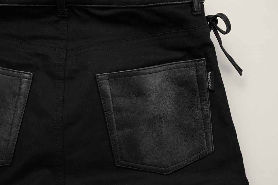 ・前身頃はシープレザー、後身頃はストレッチツイルの別布仕様で履きやすい