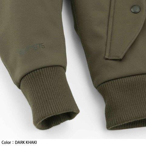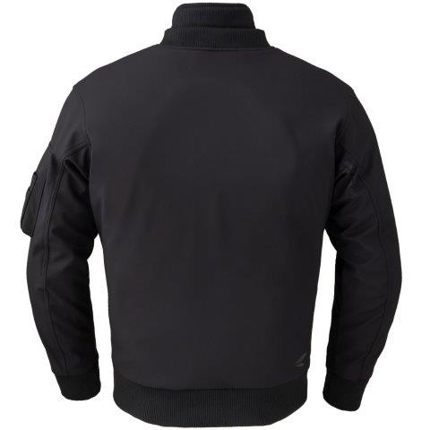 定番のMA-1スタイルを防風性やストレッチ性をもつソフトシェル生地で仕上げた、ミリタリーテイストのライディングジャケット。