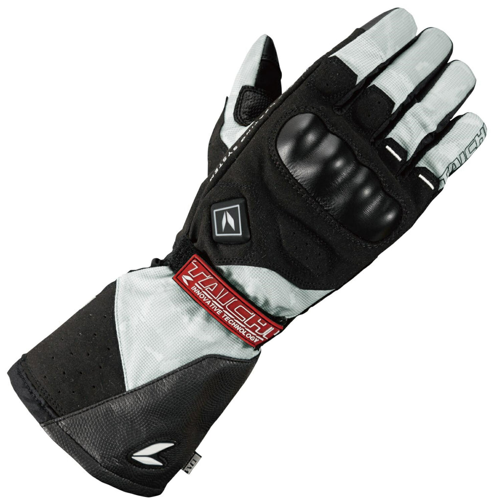 ハードタイプのナックルプロテクターを採用した、遊び心のあるカジュアルなグラフィックデザインの電熱グローブ(ロングカフタイプ)。発熱ユニットは、指先と手の甲に配置しています。