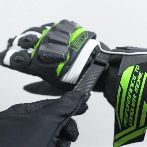 カーボンナックルプロテクターを特許技術のフローティング仕様とすることで高いプロテクション性能と良好な操作性を実現。ロング丈に2本ベルトでさらに手首から冷気の侵入を防ぐ。