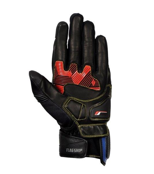 手の甲側はオリジナルカーボンナックルとメッシュ生地で安全性と快適性を、掌側はゴートレザーとパームスライダーで操作性と耐久性を追求