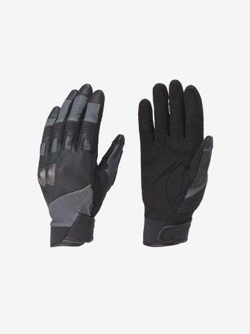 手のひら側には耐久性の高い人口皮革を使用し、バイクからハンドルを通じて伝わってくる振動を軽減するため、各所に衝撃吸収素材を配置。運転操作を阻害しないよう部位ごとに素材を変更しています。また指側面には第一関節、第二関節の屈曲が多い部分には厚みのあるメッシュ、手汗が溜まりやすい付け根部分にはより荒いメッシュを使用し、手のひら側の関節部分にも耐久性の高いメッシュを使用し、素材を適材適所切り替えることで、長時間走行時もムレを気にせず快適な内部環境を保ちます。手の甲側はリサイクルポリエステルをベースとして指の関節部分には蛇腹素材を入れることで、曲がりを阻害せず操作しやすくなっています。ナックル部分にはカーボンナックルを内蔵し、万が一の転倒時のプロテクションが可能です。人差し指側面には導電素材を配置し、グローブをしたままでもスマートフォンの操作が可能です。