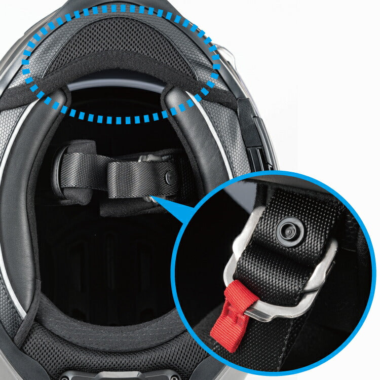 ・チンカーテンが標準で付属。あご下からの巻き込み風や、風切り音を軽減します。また、あごひもはDリング式を採用しています