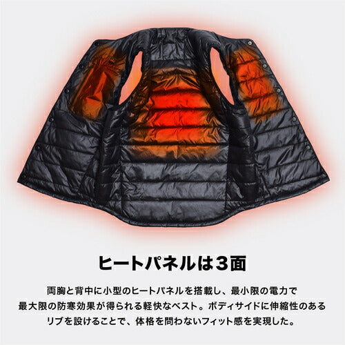 両胸と背中に小型のヒートパネルを搭載し、最小限の電力で最大限の防寒効果が得られる軽快なベスト。ボディサイドに伸縮性のあるリブを設けることで、ライダーの体格を問わないフィット感を実現した。バイクのみならずアウトドアシーンや普段使いでも活躍する。