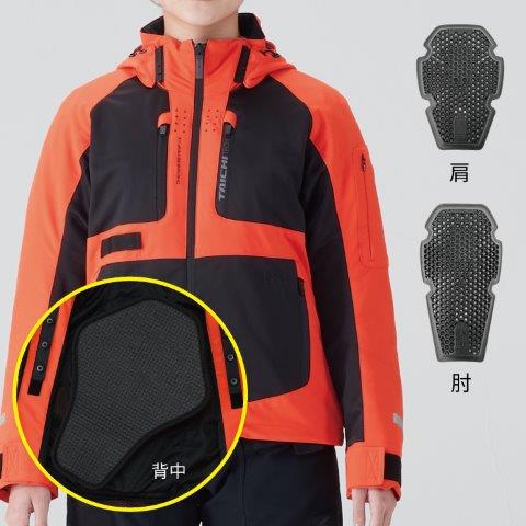 肩・肘には、衝撃吸収性能と柔軟性に優れたCE Lv.1プロテクター(ソフトタイプ)、背中にはフォームパッドを内蔵。別売りのプロテクターと入れ替えてアップグレードも可能。