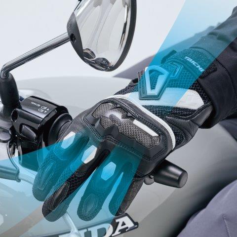 通気性とストレッチ性に優れたエアスルーメッシュを広範囲に使用し、快適さとレーシンググローブ譲りの高い保護能力を兼ね備える春夏向けメッシュグローブ。
