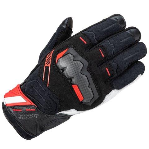 防水仕様で雨天時の着用も可能。 掌のプロテクターにカーボン素材を、甲にはレーシンググローブ譲りのカーボンナックルプロテクターを採用。