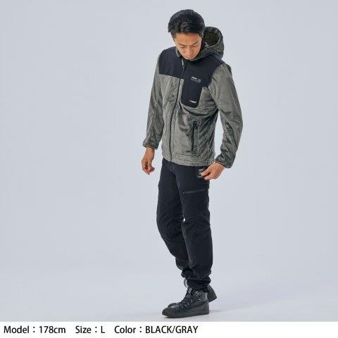 保温性に優れ、着心地のやわらかさが特徴的なフリースタイプの電熱インナーパーカ。休憩時、ライディングジャケットを脱いだ後も普段着のような感覚でカジュアルに着こなせます。発熱ユニットは、バイクの乗車姿勢において密着する両肩と背中に配置。