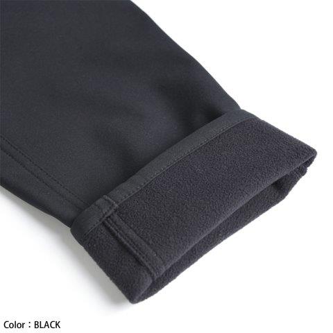 防風性・ストレッチ性に優れたソフトシェル生地を表地に、肌触りの良いフリース生地を裏地として採用。