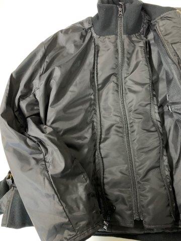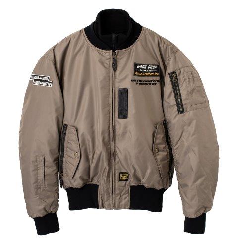 MA-1をベースに質の良いツイル生地を使用したナイロンジャケットです。右腕(切り文字ロゴ)・背面オーバルワッペン本革を使用。着脱が可能なネックウォーマーを装備し、襟元と前からの冷気をシャットアウト。着脱可能なインナーは透湿防水フィルム内蔵+中綿入りにより、保温効果アップ。袖と裾のリブニットにネオプレーンを挟むことにより、リブの伸び過ぎを防止します。秋・冬・春の3シーズンに対応可能。バイクを降りた後でも違和感の無いデザインのジャケットです。